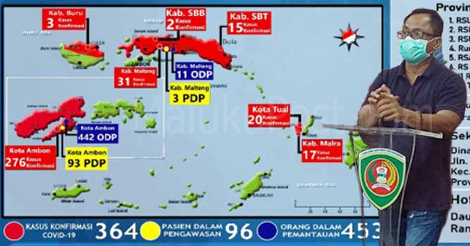 Kasrul menambahkan, untuk Pasien Dalam Pengawasan (PDP), masih terdapat 96 orang, tersebar di Ambon 93 orang, Maluku Tengah 3 orang. sedangkan untuk Orang Dalam Pemantauan (ODP) 453 orang, tersebar di Ambon 442 orang, Maluku Tengah 11 orang.
