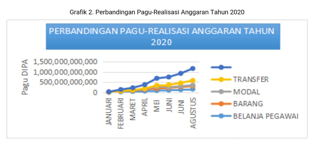 Berdasarkan grafik 1, dapat diketahui dari bulan Mei 2020 sampai dengan Agustus 2020 menunjukkan peningkatan pencairan anggaran APBN yang cukup tinggi. Dari Totap Pagu DIPA yang dikelola KPPN Tual Tahun Anggaran 2020 sebesar Rp1,221,898,997,000,- realisasi sampai dengan bulan Agustus 2020 sebesar 584,269,098,959,- atau sebesar 47.82%. Adapun Pagu DIPA Tahun 2019 sebesar 1,450,256,440,000,- dengan realisasi anggaran sampai dengan bulan Agustus 2019 sebesar Rp678,618,036,407,- atau sebesar 46.79% dan dapat disimpulkan meningkat sebesar 1.03% dibandingkan dengan periode yang sama Tahun Anggaran 2019.