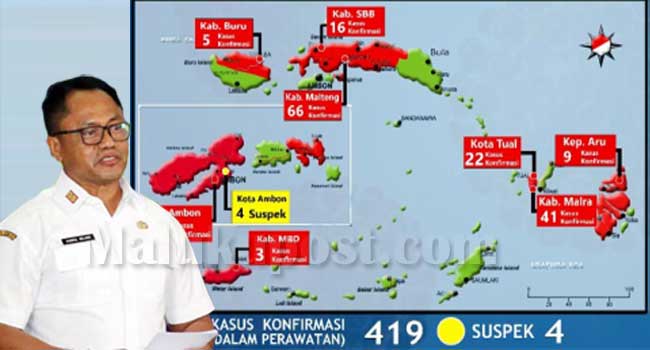 Sementara itu, terdapat penamgahan 4 kasus baru dari Ambon. sehingga dari 7218 kasus konfirmasi, 419 diantaranya masih dalam terawatan tersebar di Ambon 257 kasus, MBD 3 kasus, Maluku Tenggara 41 kasus, Tual 22 kasus, Kepulauan Aru 9 kasus, SBB 16 kasus, Buru 5 kasus, Maluku Tengah 66 kasus.